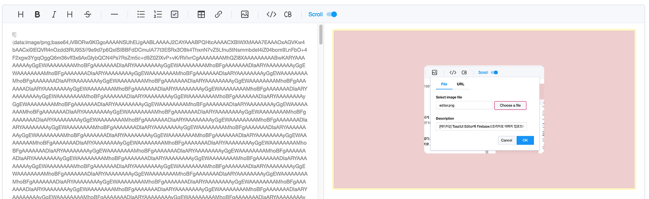 - toastUI에서 이미지를 추가하면, 아래와 같이 base64 인코딩된 문자열로 업로드되고, 스크롤을 보면 알겠지만 그 길이가 어마어마하며, 이상태로 DB에 저장되게 된다.
